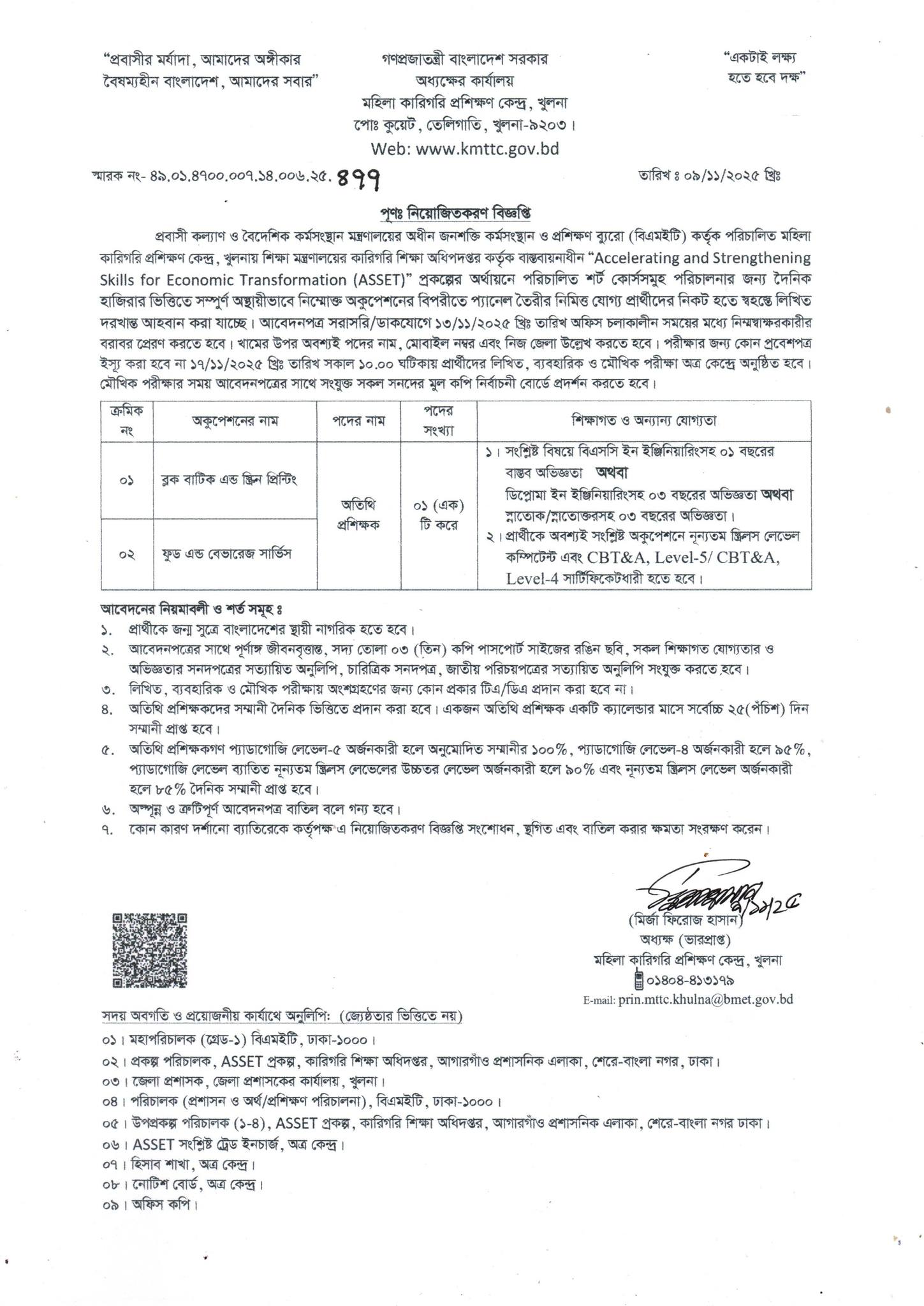 | ২ | মহিলা টিটিসি, খুলনার অ্যাসেট প্রকল্পের আওতায় ৭ম সাইকেল (নভেম্বর/২০২৫ হতে জানুয়ারি/২০২৬) ব্যাচের ভর্তি পরীক্ষার ফলাফল প্রকাশ | ০২-১১-২০২৫ | দেখুন |